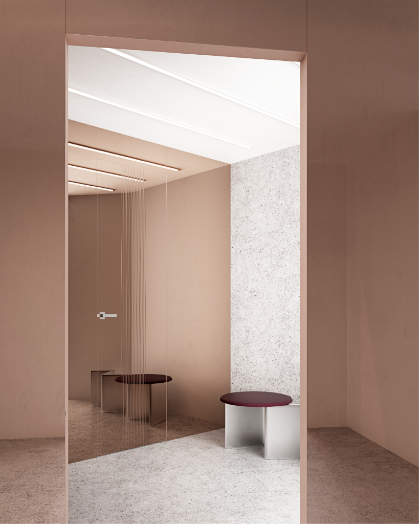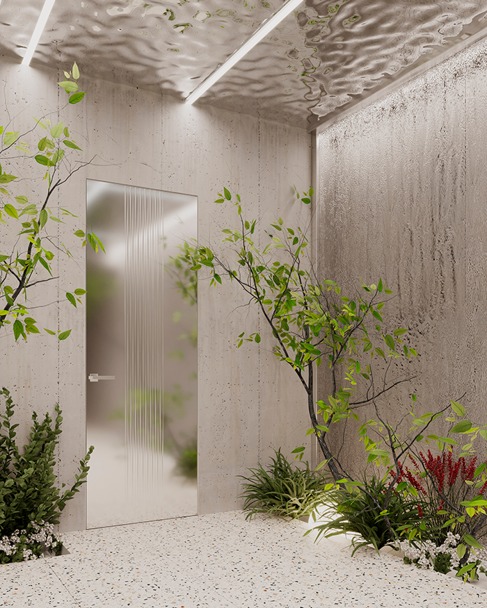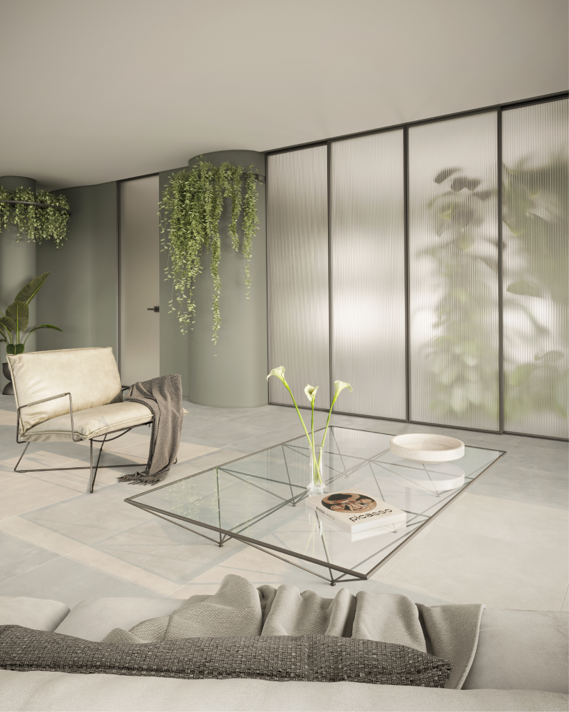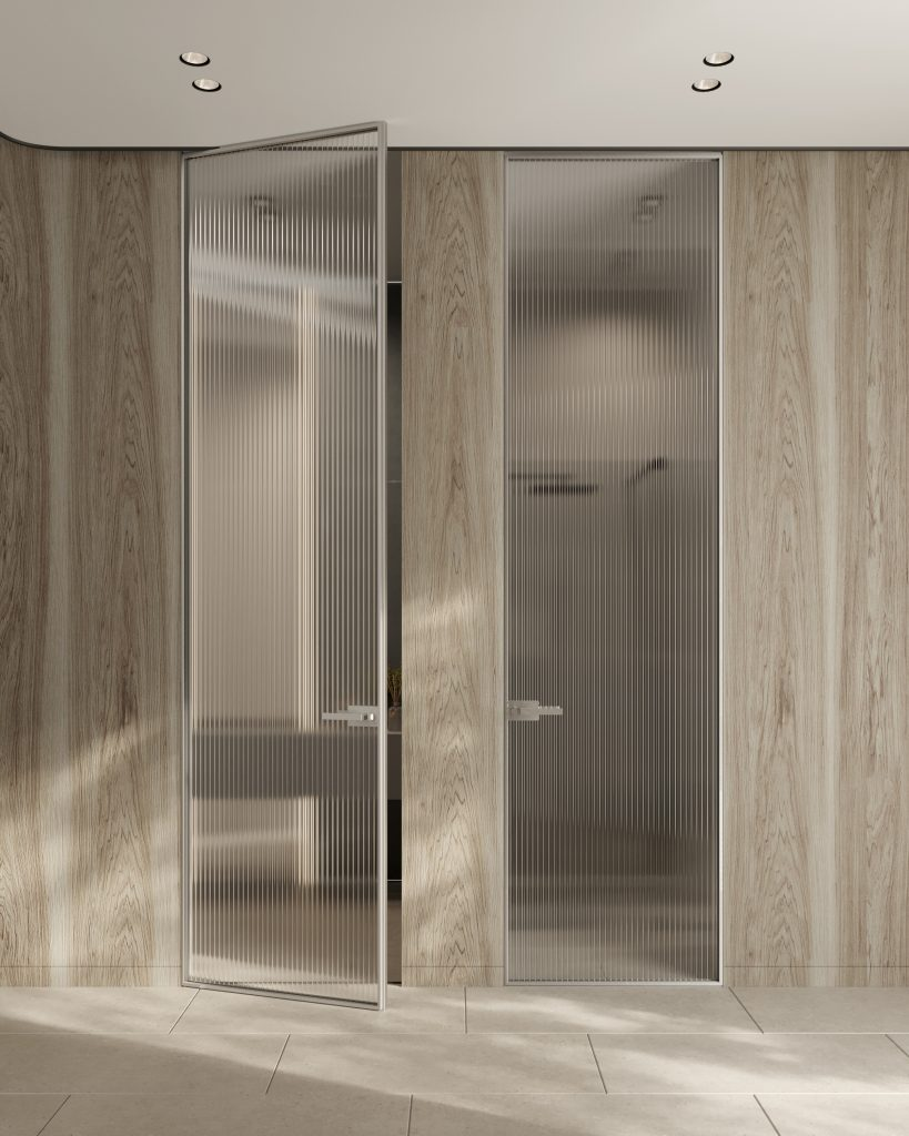 На рендере: стеновые панели Sofia в стекле T25 и стеклянная дверь из коллекции Rain в том же стекле T25.