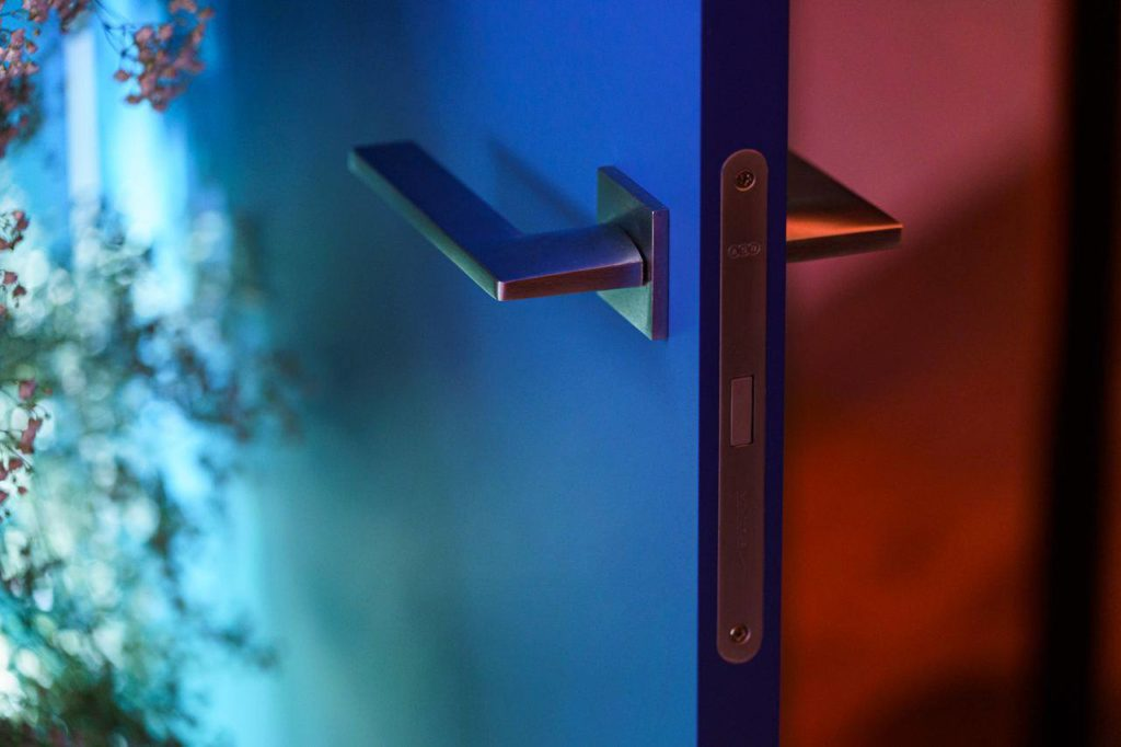 Кроме того, мы организовали уникальную фотозону, где была представлена дверь как арт-объект, оформленная стеновыми панелями 5G и выполненная в красочном градиенте, дополненная нежной цветочной композицией.