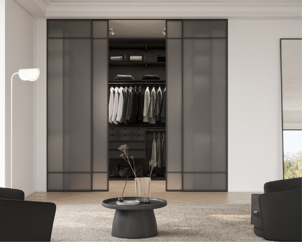 Идеальные непрозрачные стекла в цвете графит. Стекло пропускает лишь нечеткие силуэты, защищает от попадания прямых солнечных лучей. Поэтому дверь или межкомнатная перегородка с графитовым стеклом идеально подходит для установки в гардеробе.