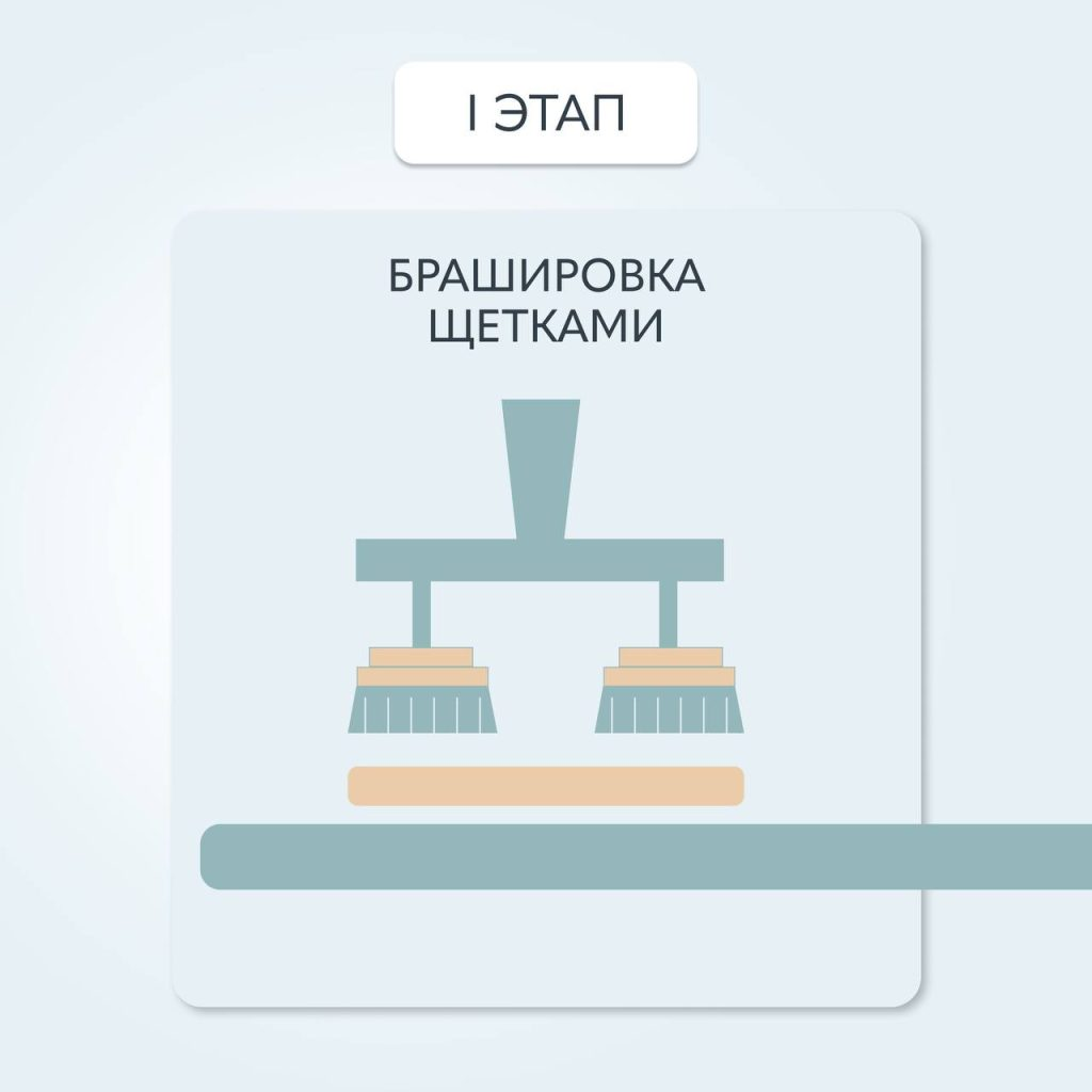 Брашируем – придаём шпону выраженную структуру семью щетками с различной жесткостью. Каждая щетка выполняет свою задачу: мягкие делают поверхность более гладкой, в то время как жесткие создают рельеф и текстуру.