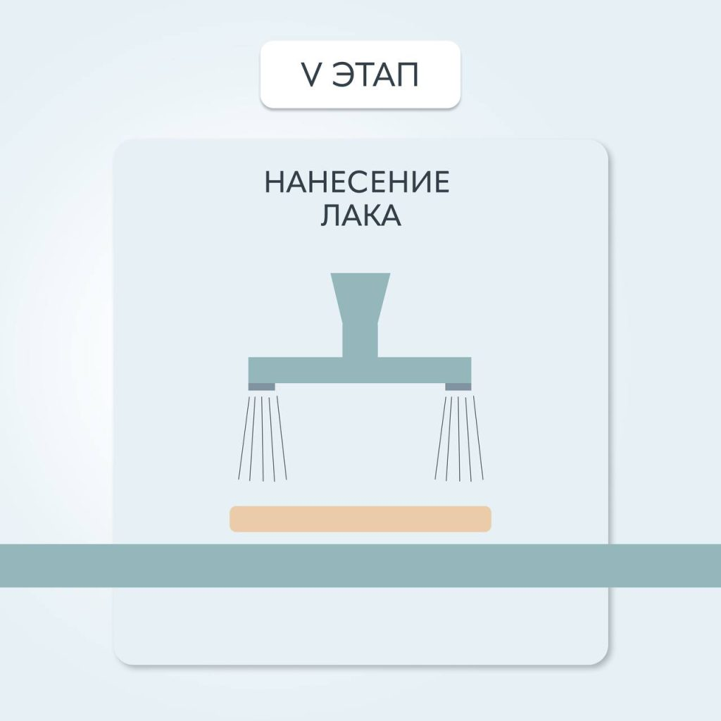 Нанесение итальянского прозрачного лака на водной основе. Этот финишный слой не только придает шпону красивый блеск, но и защищает его от внешних воздействий. Лак создает прочное покрытие, которое обеспечивает долговечность и стойкость к повреждениям.