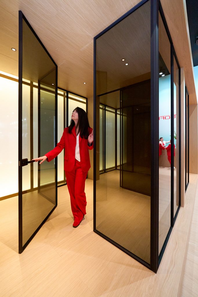 На стенде была показана разработка коллекции «1000 Линий», которая будет доступна в ближайшее время. Она включает в себя элементы, позволяющие создавать статичные перегородки и двери с фрамугой. Это открывает перед нашими клиентами невероятные возможности для реализации их идеального пространства, будь то гардеробная комната или функциональное разделение пространства в доме.