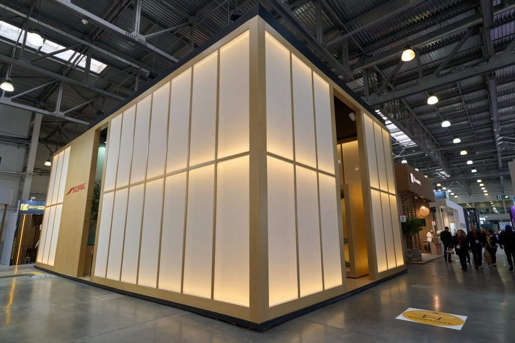 Вместе с командой фабрики стенд разработали Висенте Гарсия Хименес и Чинция Кумини, итальянская студия Garcia Cumini. Архитекторы спроектировали лаконичное и светлое пространство площадью 135 кв. метров, ставшее оазисом тишины и спокойствия на шумной выставке. Аскетичный, но элегантный «дом света» символизирует дом человека будущего — того, кто ценит удобство и функциональность вместо навязчивого декора, отсекает все лишнее, постоянно развивается и стремится жить в гармонии с природой.