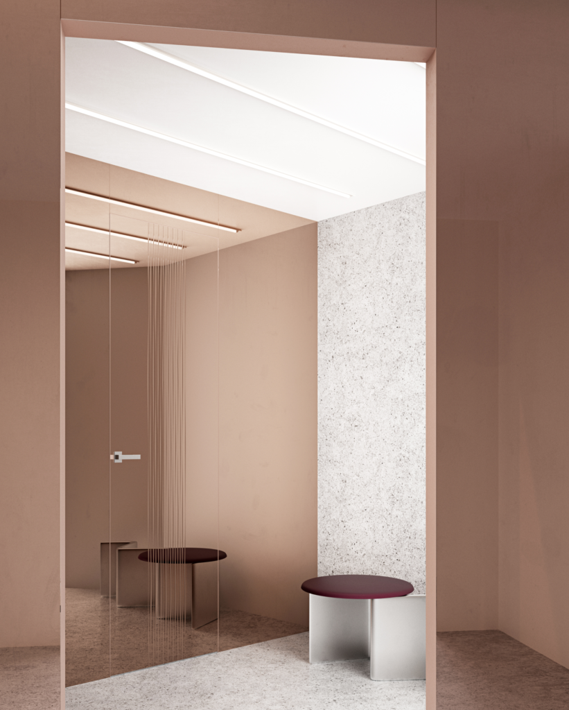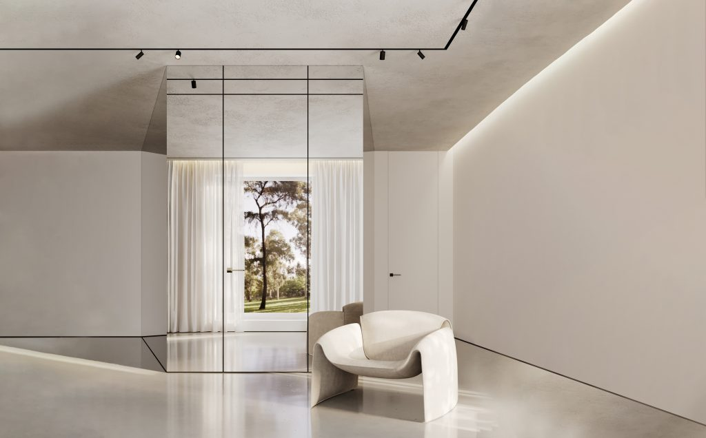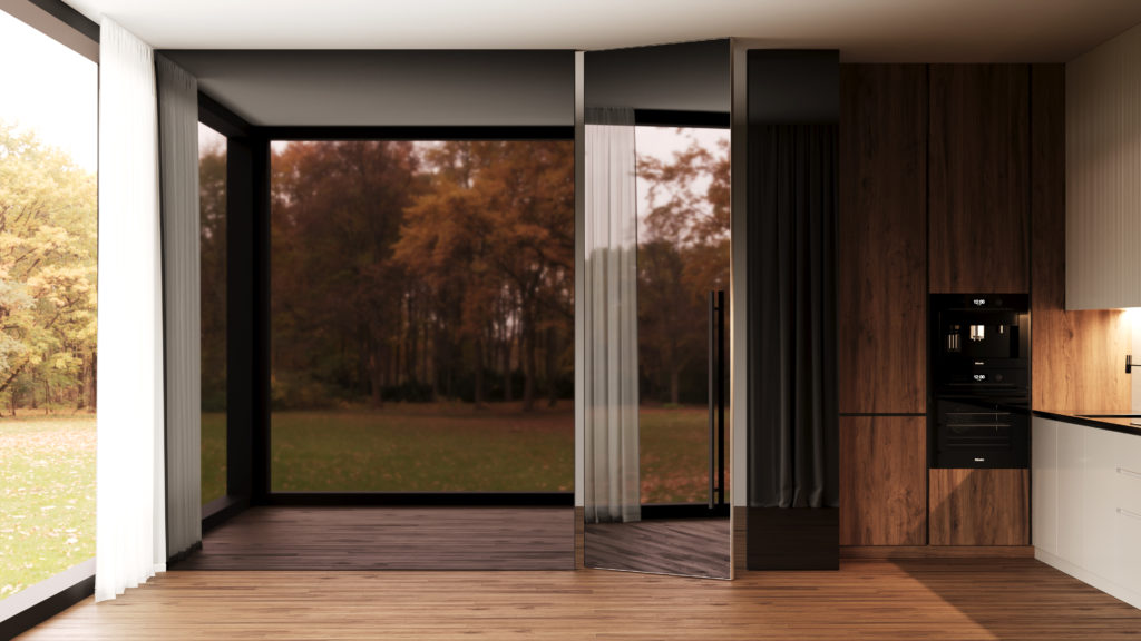 Переход между полотном и вставкой, плотном и стеновыми панелями совершенно невидим – конструкция выглядит как единый гладкий элемент, а дверь выдает только ручка.