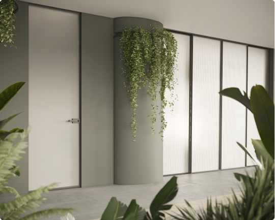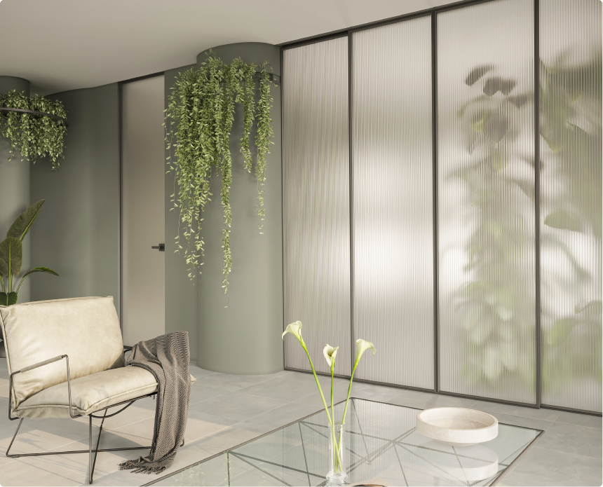 Стеклянные двери и межкомнатные перегородки в таком интерьере дадут пространству больше света и воздуха. В коллекциях Grafica и 1000 линий можно выбрать стекло на любой вкус: широкое или мелкое рифление, сверхпрозрачное, матовое или зеркальное. Алюминиевый профиль также имеет множество вариантов окрашивания по RAL и NSC в зависимости от вашей задачи: создать акцент цветом или соединить пространство в одном стиле.